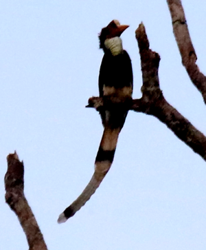 The helmeted hornbill (Rhinoplax vigil) is a very large bird in the hornbill family. It is found on the Malay Peninsula, Sumatra, Borneo, Thailand and Myanmar. The casque (helmetlike structure on the head) accounts for some 11% of its 3 kg weight. Unlike any other hornbill, the casque is almost solid, and is used in head-to-head combat among males.[3] It is a belief among the Punan Bah that a large helmeted hornbill guards the river between life and death.[4]