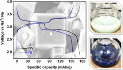 قام الباحثون بتجميع مادة كاثود أبيض پروسيا ودرسوا أداء تخزين أيون الصوديوم السريع والمستقر في درجات حرارة تصل إلى 70 درجة مئوية.[6]