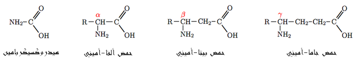 يعتبر هيدروكسي كرباميد Hydroxycarbamide الحمض الأميني الأبسط من حيث التركيب فهو متكون من جذر أميني متصل مباشرة بكربون جذر الهيدروكسيل. وهذا المركب غير أحيائي. أما في بقية الأحماض الأمينية فتدخل ذرة أو أكثر من الكربون بين هذين الجذرين. و يحدد موقع الأمين في السلسلة الكربونية الفئة التي ينتمي اليها الحمض الأميني كما يلي: