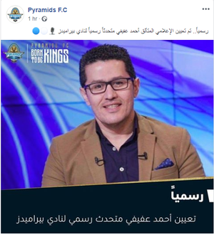 أعلن نادي بيراميدز المصري تعيين أحمد عفيفي في منصب المتحدث الرسمي باسم النادي بتاريخ 30 يناير 2019، وهو المنصب الذي سبقه فيها اللاعب المصري السابق أحمد حسن.