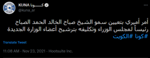 - ^ كونا (2021-11-23). "أمير الكويت يعيد تكليف صباح الخالد الصباح بتشكيل الوزارة الجديدة". روسيا اليوم.