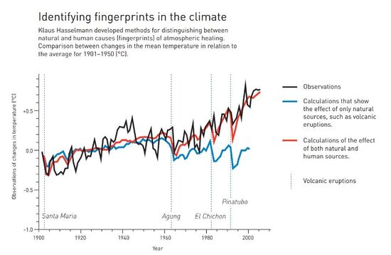 بمجرد الانتهاء من نموذج التغيرات المناخية، طور هاسلمان أساليب لتحديد تأثير الإنسان على النظام المناخي. وجد أن النماذج، إلى جانب الملاحظات والاعتبارات النظرية، تضم معلومات كافية عن خصائص الضوضاء والإشارات. على سبيل المثال، التغييرات في الإشعاع الشمسي أو الجسيمات البركانية أو مستويات غازات الدفيئة تترك إشارات فريدة وبصمات يمكن فصلها. يمكن أيضًا تطبيق هذه الطريقة لتحديد بصمات الأصابع على تأثير البشر على نظام المناخ. وهكذا مهد هاسلمان الطريق لمزيد من الدراسات المتعلقة بتغير المناخ، والتي أظهرت آثارًا لتأثير الإنسان على المناخ باستخدام عدد كبير من الملاحظات المستقلة. تحستا النماذج المناخية بشكل كبير حيث يتم رسم خرائط أكثر شمولاً للعمليات المتضمنة في التفاعلات المعقدة للمناخ، ليس أقلها من خلال قياسات الأقمار الصناعية ورصد الطقس. تظهر النماذج بشكل واضح تأثير الاحتباس الحراري المتسارع؛ منذ منتصف القرن التاسع عشر، ارتفعت مستويات ثاني أكسيد الكربون في الغلاف الجوي بنسبة 40%ة. لم يكن الغلاف الجوي للأرض يحتوي على هذا الكم من ثاني أكسيد الكربون لمئات الآلاف من السنين. وفقًا لذلك، تُظهر قياسات درجة الحرارة أن العالم قد ارتفعت درجة حرارته بمقدار درجة مئوية واحدة على مدار 150 سنة مضت.