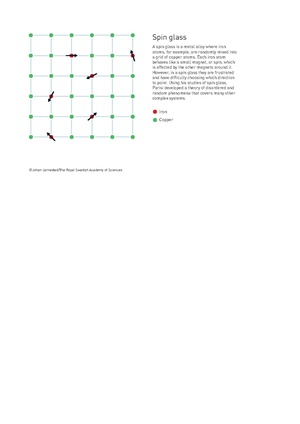 تعتبر هذه الكرات المضغوطة نموذجًا بسيطًا للزجاج العادي والمواد الحبيبية، مثل الرمل أو الحصى. ومع ذلك، كان موضوع عمل باريزي الأصلي مختلفًا نوعًا فقد كان عن «الزجاج الغزل(زجاج سپين– spin glass». ويعد الزجاج الدوار هذا نوع خاص من السبائك المعدنية حيث يتم خلط ذرات الحديد بشكل عشوائي، على سبيل المثال، في شبكة من ذرات النحاس. على الرغم من وجود عدد قليل من ذرات الحديد، إلا أنها تغير الخصائص المغناطيسية للمادة بطريقة جذرية ومحيرة للغاية. إذ تتصرف كل ذرة حديد كمغناطيس صغير، ويطلق على الذرة الواحدة "غزل (سپين)"، وتتأثر بذرات الحديد الأخرى القريبة منها. في المغناطيس العادي، تدور جميع الدورات في نفس الاتجاه، ولكن في الدوران الزجاجي؛ تريد بعض أزواج الدورات أن تشير في نفس الاتجاه وأخرى تريد أن تشير في الاتجاه المعاكس وتسمى هذه الظاهرة ب « الإحباط – frustration ».