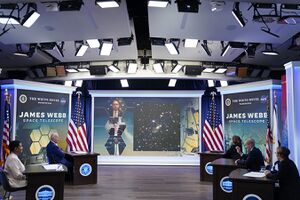 - الرئيس جو بايدن يكشف عن صورة لعنقود المجرات SMAC3S 072، المعروف باسم أول صورة عميقة لوِب، خلال حدث في البيت الأبيض.