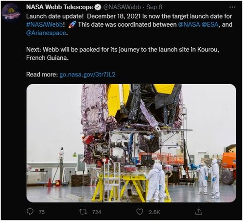 في 9 سبتمبر 2021، كشفت وكالة ناسا أنها ستُطلق تلسكوب الفضاء "جيمس ويب" من الجيل القادم المرتقب بشدة على متن صاروخ آريان 5 التابع لوكالة الفضاء الأوروبية في 18 ديسمبر القادم.[1]