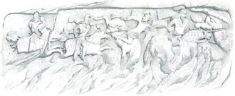 1840 illustration of a Sasanian relief at Firuzabad, showing Ardashir I's victory over Artabanus IV and his forces.