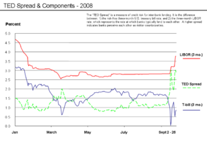 Key risk indicators became highly volatile during September 2008, a factor leading the U.S. government to pass the Emergency Economic Stabilization Act of 2008. The “TED spread” is a measure of credit risk for inter-bank lending. It is the difference between: 1) the risk-free three-month U.S. treasury bill rate; and 2) the three-month London InterBank Offered Rate (LIBOR), which represents the rate at which banks typically lend to each other. A higher spread indicates banks perceive each other as riskier counterparties. The t-bill is considered "risk-free" because the full faith and credit of the U.S. government is behind it; theoretically, the government could just print money so that the principal is fully repaid at maturity. The TED spread reached record levels in late September 2008. The diagram indicates that the Treasury yield movement was a more significant driver than the changes in LIBOR. A three month t-bill yield so close to zero means that people are willing to forgo interest just to keep their money (principal) safe for three months – a very high level of risk aversion and indicative of tight lending conditions. Driving this change were investors shifting funds from money market funds (generally considered nearly risk free but paying a slightly higher rate of return than t-bills) and other investment types to t-bills.[58] These issues are consistent with the September 2008 aspects of the subprime mortgage crisis which prompted the Emergency Economic Stabilization Act of 2008 signed into law by the U.S. President on October 2, 2008.