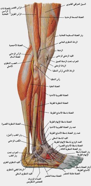 ـ الناحية الأمامية للساق والقدم: في هذه الناحية العضلات الظنبوبية الأمامية tibialis anterior وباسطة الأصابع الطويلة extensor digitorum وباسطة الإبهام ويعصبها العصب الشظوي العميق ويغذيها الشريان الظنبوبي الأمامي.