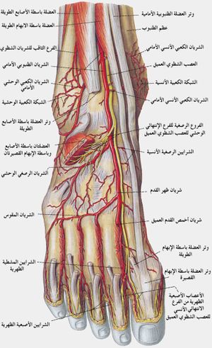أعصاب ظهر القدم اليمنى وشرايينها. أزيل قيد الباسطات السفلي ومعظم أجزاء العضلتين باسطة الأصابع الطويلة والقصيرة وكذلك العضلة باسطة الإبهام القصيرة. كما أزيلت جميع الأوردة والأعصاب عدا الفروع الانتهائية للعصب الشظوي العميق (الأعصاب الأصبعية الظهرية).