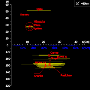 The orbits of Jupiter's irregular satellites, and how they cluster into groups: by semi-major axis (the horizontal axis in Gm); by orbital inclination (the vertical axis); and orbital eccentricity (the yellow lines). The relative sizes are indicated by the circles.