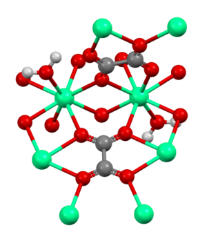 Portion of CaC2O4·2H2O lattice, highlighting the connectivity of the oxalate ligand.[1](Carbon: black; Oxygen: red; Calcium: green)