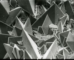 Scanning electron micrograph of the surface of a kidney stone showing tetragonal crystals of Weddellite (calcium oxalate dihydrate) emerging from the amorphous central part of the stone (the horizontal length of the picture represents 0.5 mm of the figured original)