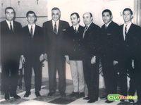 جمال عبد الناصر ويقف بجانبه هادي فهمي رئيس الأتحاد المصري لكرة اليد. وعلى يمين الصورة يقف المهندس سامح فهمي وزير البترول الأسبق‎.