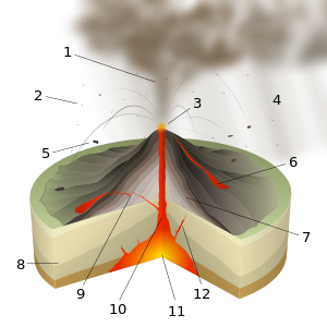 Diagram of a Vulcanian eruption. (key: 1. Ash plume 2. Lapilli 3. Lava fountain 4. Volcanic ash rain 5. Volcanic bomb 6. Lava flow 7. Layers of lava and ash 8. Stratum 9. Sill 10. Magma conduit 11. Magma chamber 12. Dike) Click for larger version.