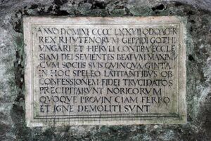 Much later, a memorial plate from 1521 found in the catacombe Chapel of St Maximus in Petersfriedhof—the burial site of St Peter's Abbey in Salzburg (Austria)—mentions Odoacer as King of "Rhutenes" or "Rhutenians" (لاتينية: Rex Rhvtenorvm), who invaded Noricum in 477. Due to its very late date of 1521 and several anachronistic elements, the content of that plate is considered nothing more than a legend.[20] In spite of that, the plate has become a popular "source" for several theorists that try to connect Odoacer with ancient Celtic Ruthenes, and also with later Slavic Ruthenians.[21] Historian Paul R. Magocsi argues such theories should be regarded as "inventive tales" of "creative" writers and nothing more.[22]