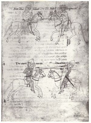 An early illustration of a mythologized Theodoric killing Odoacer in a joust. From the Chronica Theodericiana (1181).
