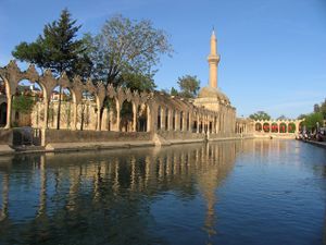 Ancient Edessa was an eclectic melting pot of different religious groups.[18]:92 Unlike Harran, where the cult of the moon god Sin predominated, the people of Edessa worshipped a whole pantheon of gods that can generally be identified with planets.[9]:195 The most important were Nabu and Bel.[18]:92 The cult of the sun and moon that was later known in Harran as the Sabians also had followers in Edessa.[18]:92 The fertility goddess Atargatis, whose cult was based at Manbij, was also worshipped in Edessa.[18]:92 Fish were an important symbol of Atargatis, and in ancient Edessa there was a fish pond filled with sacred carp dedicated to Atargatis – today's Balıklıgöl.[20]:79-80 Other gods worshipped in pagan Edessa included the Nabataean deity Dushara, the Mesopotamian goddess Ishtar, and also the moon god Sin.[18]:93 Another important cult at Edessa involved the veneration of a virgin mother and her child.[18]:93