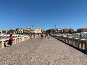 - Pontile di Ostia, it is a platform on the sea, symbol of the Roman coast, which acts as a panoramic terrace overlooking the sea. It was once the platform that connected to the "Roma bathing establishment", with the outbreak of the World War II and, following the events of the armistice of Cassibile in 1943, it was destroyed by the Axis powers retreating from Rome.[6]