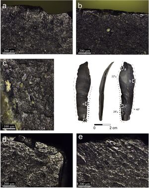 Composite Sickles for Cereal Harvesting at 23,000-Years-Old Ohalo II. Artifact with micrographs of the semi-ripe cereal use and prehension wear