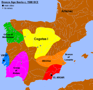 خريطة العصر البرونزي المتأخر في أيبيريا، ح. 1300 ق.م.، تُظهر المناطق الثقافية الرئيسية. النقاط تبين بقايا منعزلة لتلك الثقافات خارج مناطقها الرئيسية
