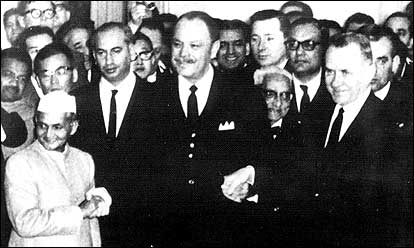 أيوب خان في 1965 زار القاهرة حيث التقى ثلاث زعماء تكرههم أمريكا، ناصر و تشوإن لاي وسوكارنو. فكتبت الخارجية الأمريكية إلى الرئيس جونسون: "خان أصبح أكبر من حذائه ويحتاج تحجيمه." كخطوة أولى، صدرت توصية إلى البنك الدولي بتأجيل قرض بـ 550مليون$.