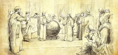 الإدريسي في قاعة روجر الثاني مع حشد من الوجهاء والأمراء ويقوم الإدريسي بشرح كروية الأرض.