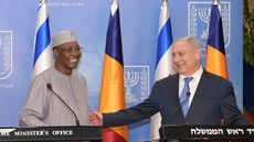 رئيس الوزراء الإسرائيلي بنيامين نتانياهو والرئيس التشادي إدريس ديبي في مؤتمر صحفي عُقد في القدس أثناء زيارة ديبي إسرائيل، 25 نوفمبر 2018. صرح ديبي أثناء المؤتمر الصحفي قائلاً: "يجعمنا النضال المشترك، ضد شيطان هذا القرن الكريه، الإرهاب".