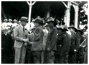 Edward visited poverty-stricken areas of Britain,[29] and undertook 16 tours to various parts of the Empire between 1919 and 1935. On a tour of Canada in 1919, he acquired the Bedingfield ranch, near Pekisko, Alberta,[30] and in 1924, he donated the Prince of Wales Trophy to the National Hockey League.[31] He escaped unharmed when the train he was riding in during a tour of Australia was derailed outside Perth in 1920.[32]