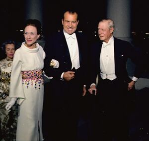 In 1955, they visited President Dwight D. Eisenhower at the White House. The couple appeared on Edward R. Murrow's television-interview show Person to Person in 1956,[131] and in a 50-minute BBC television interview in 1970. On 4 April of that year President Richard Nixon invited them as guests of honour to a dinner at the White House with Chief Justice Warren E. Burger, Charles Lindbergh, Alice Roosevelt Longworth, Arnold Palmer, George H. W. Bush, and Frank Borman.[132][133]