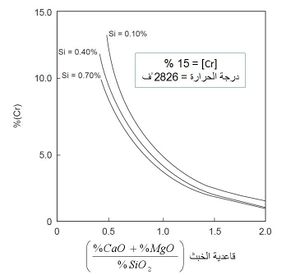 ومقارنة بذلك يتطلب وعاء AOD المبطن بحراريات دولوميت خبث بقاعدية أعلى: أى أن نسبة القاعدية "V" تكون بين 1,4 و2. وأحد أسباب الاستخدام المكثف لبطانات الدولوميت في أوعية AOD هو أن العديد من الفوائد المتالورجية يمكن الحصول عليها بالتشغيل عند قاعديات عالية للخبث. وتشمل هذه الفوائد مقدرة أكبر على إزالة الكبريت "الزكبتة" واسترداد العناصر السبائكية. يوضح شكل5 المقدرة العالية لقاعدية الخبث المرتفعة على استرداد الكروم. وفيما يلى نذكر نوبذات عن ممارسة التحكم في الخبث عند استخدام بطانات الدولوميت.