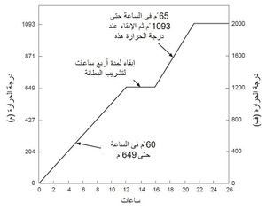يوضح شكل 4 منحنى التسخين المتقدم المُوَصَّى به لكافة بطانات أوعية AOD. يبدأ التسخين برفع درجة الحرارة 60 ْم كل ساعة، حتى تصل إلى 650 ْم. وفى هذه النقطة تُشَرَّب البطانة لمدة أربع ساعات. ويُستأنف بعدها التسخين بمعدل 65 ْم/س حتى 1100 ْم. وإذا لم يسمح الوقت بفترة تشريب، فتُستأنف دورة التسخين مباشرة بمعدل 65 ْم/س عند الوصول إلى 650 ْم. ويجب أن تتشبع البطانات بالحرارة عند 1100 ْم لفترة أكبر من أربع ساعات قبل دخولها في الخدمة. وإعادة تسخين الحراريات المستخدمة من قبل يمكن أن يتم بمعدل 65 ْ إلى 95 ْم/س حتى تصل درجة الحرارة إلى 1100 ْم.