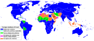إسرائيل (بالعبرية: יִשְׂרָאֵל‎، يسرائل؛ إنگليزية: Israel) رسمياً دولة إسرائيل (מְדִינַת יִשְׂרָאֵל ، مدينت يسرائل؛ إنگليزية: State of Israel)، هي بلد في قلب العالم العربي، في غرب آسيا يقع على الضفة الشرقية للبحر المتوسط. وتحتل الجولان السورية والضفة الغربية الفلسطينية وتحاصر قطاع غزة. يحدها من الشمال لبنان، ومن الشمال الشرقي سوريا ومن الشرق الضفة الغربية من فلسطين والأردن ومن الجنوب الغربي قطاع غزة من فلسطين ومصر.[22] ينص دستور إسرائيل على أنها الوطن القومي لليهود وهي بذلك الدولة الوحيدة في العالم التي ينص دستورها على أنها وطن قومي لديانة بعينها[23] بتعداد سكان يبلغ 7.4 مليون نسمة، عدد اليهود فيهم هو 5.57 مليون[24][25] منهم نحو 500,000 نسمة من الروس المسيحيين الارثوذكس الذين هاجروا في التسعينات على أنهم يهود. أكبر مجموعة أقلية عرقية هي عرب إسرائيل، وتقسمهم إسرائيل إلى تقسيمات مختلفة حسب الدين ومكان الإقامة والأصل ومنها مسلمون، مسيحيون، دروز، بدو، شركس وسامريون وغيرهم، وتطبق عليهم بالتالي قواعد مختلفة.