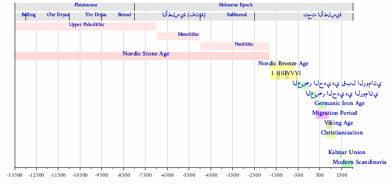 يعود إعمار اسكندنافية إلى أكثر من 5000 سنة قبل الميلاد، إذ استوطنها أقوام ذوو أصول جرمانية شمالية ينتمون إلى اللغات الهندو-اوروبية، انطلقت منها قبل بضعة قرون من الميلاد لإعمار مناطق متفرقة من السهل الأوربي الكبير، ممثلة بطلائع السلالة النوردية (الشمالية) السائدة التي يتكلم أحفادها اليوم ثلاث مجموعات من اللغات هي: