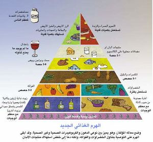 ■ قدمت وزارة الزراعة الأمريكية الهرم الغذائي في عام 1992، فأوصت الناس بتجنب الدهون وبتناول الكثير من الأغذية الغنية بالكربوهيدرات، كالخبز والحبوب والرز والمعجنات. وهدفت إلى تخفيف استهلاك الدهون المشبعة التي ترفع مستويات الكولستيرول. ■وجد الباحثون أن المدخول العالي من الكربوهيدرات المكرَّرة (مثل: الخبز الأبيض والرز الأبيض) يمكن أن يشيع الفوضى في مستويات الگلوكوز والإنسولين في الجسم. وإن الاستعاضة عن هذه الكربوهيدرات بالدهون المفيدة للصحة (أحادية اللاتشبع أو عديدة اللاتشبع) تخفض في الواقع من مخاطر إصابة المرء بأمراض القلب. ■ ويقترح خبراء التغذية الآن هرما غذائيا جديدا يشجع على استهلاك الدهون المفيدة للصحة والأغذية المعدة من الحبوب الكاملة وتجنب الكربوهيدرات المكرَّرة والزبدة واللحوم الحمراء. |