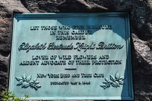 In 1940, a memorial plaque in honor of Britton was installed in the new Wild Flower Garden of the New York Botanical Garden. A gift of the New York Bird and Tree Club, it is mounted on a ten-ton boulder of Bronx schist, and its text reads, "Let those who find pleasure in this garden remember Elizabeth Gertrude Knight Britton, lover of wildflowers and ardent advocate of their protection".[43] The garden is now known as the Native Plant Garden, and the boulder as Britton Rock.[44]