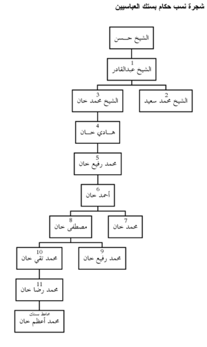 الحكام | 1673– 1724 عبد القادر بن حسن 1725– 1739 محمد سعيد بن عبد القـادر 1739– 1783 محمد بن عبد القـادر 1783– 1803 هـادي بن محمـد بن عبد القـادر 1803– 1804 محمد رفيع بن هادي بن محمد 1804– 1840 أحمد بن محمد رفيع بن هادي 1840– 1882 مصطفى بن أحمد بن محمد 1882– 1883 محمد رفيـع بن مصطفى بن أحمـد 1883– 1927 محمد تقي "صولة الممالك" بن مصطفى بن أحمـد 1927– 1944 محمـد رضا "سطـوة الممالك" بن محمد تقـي 1944– 1967 محمد أعظم خان البستكي العباسي |