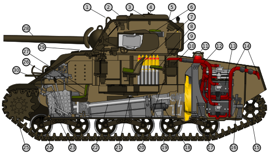 إم 4 شرمان إنگليزية: M4 Sherman كانت شرمان الدبابة الأمريكية الرئيسية خلال الحرب العالمية الثانية. كانت هذه الدبابة متوسطة الحجم تزن 35 طناً ومسلحة بمدفع 75ملم، عيار 40. وكانت لدى هذا المدفع اختراق دروع عرض 3.7 بوصة من مسافة 500 ياردة. تميزت الدبابة شيرمان بدروع قطرها 2.8 بوصة في الأمام و 1.6 بوصة في الجوانب و 1.4 بوصة في الخلف. وكانت تحمل طاقم مكون من 5 أفراد وكان بها 3 مدافع آلية.