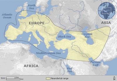 خريطة توضح توزيع إنسان النياندرتال في الزمن القديم