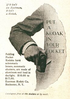 The letter k was a favorite of George Eastman's; he is quoted as saying, "it seems a strong, incisive sort of letter."[24] He and his mother, Maria, devised the name Kodak using an Anagrams set. Eastman said that there were three principal concepts he used in creating the name: it should be short, easy to pronounce, and not resemble any other name or be associated with anything else. According to a 1920 ad, the name "was simply invented – made up from letters of the alphabet to meet our trade-mark requirements. It was short and euphonious and likely to stick in the public mind."[25] The Kodak name was trademarked by Eastman in 1888.[26] There was also a rumor that the name Kodak came from the sound made by the Kodak camera's shutter.[بحاجة لمصدر]