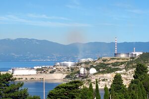 In the 1960s, as part of Rijeka's harbor extension the mineral-oil-port was moved to the bay of Omišalj on the island Krk (JANAF). A 7,2 km long and 20 inches thick pipeline led from there to Rijeka's refinery. The refinery is located 12 km south of the city and comprises an area of 3,5 square km in the districts Kostrena and Bakar. It is reachable via ship, street and railway.[4]