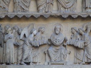 ابراهيم ممسكاً بتماثيل صغيرة للأرواح في صدر ابراهيم، والملائكة تـُحـْضـِر المزيد من التماثيل. كاتدرائية ريمز، القرن 13