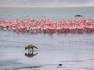 ابن آوى ذهبي يحاول صيد طائر نحام في بحيرة في فوهة نغورنغورو بتنزانيا