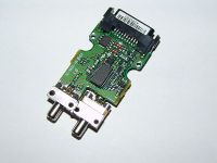 A GBIC module (shown here with its cover removed), is an optical and electrical transceiver. The electrical connector is at top right, and the optical connectors are at bottom left