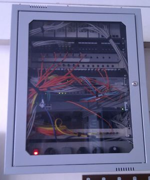 An optical fiber junction box. The yellow cables are single mode fibers; the orange and blue cables are multi-mode fibers: 62.5/125 µm OM1 and 50/125 µm OM3 fibers respectively.
