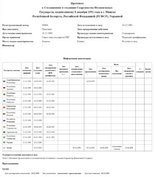 The Protocol to the Agreement on the Creation of the Commonwealth of Independent States dated 21 December 1991 was signed on 21 December 1991.[5]