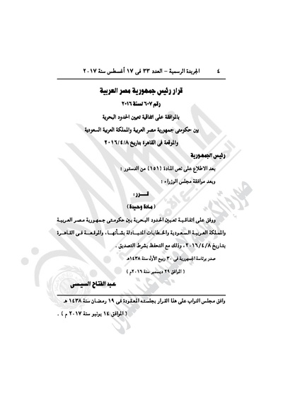 اتفاقية تعيين الحدود السعودية المصرية تم توقيعها في 8 أبريل 2016 في القاهرة من شريف إسماعيل ومحمد بن سلمان بن عبد العزيز، ولي ولي العهد السعودي، بحضور العاهل السعودي سلمان بن عبد العزيز والرئيس المصري عبد الفتاح السيسي.