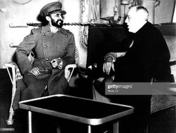 الرئيس فرانكلن روزڤلت يلتقي امبراطور إثيوبيا هيلا سيلاسي على متن الطراد الأمريكي "كوينسي" في البحيرات المرة في 14 فبراير 1945.