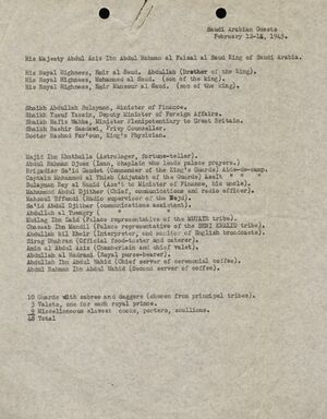 قائمة الحاضرين على متن السفينة كوينسي خلال المفاوضات بين جلالة الملك عبد العزيز، على الجانب السعودي (48 شخصاً)، في الفترة 12-16 فبراير 1945: