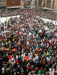 ![]() Thousands gather inside Madison Wisconsin's Capitol rotunda to protest Governor Walker's proposed bill. | |||