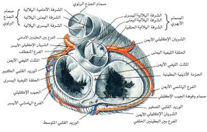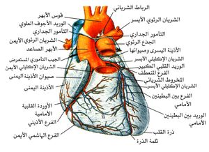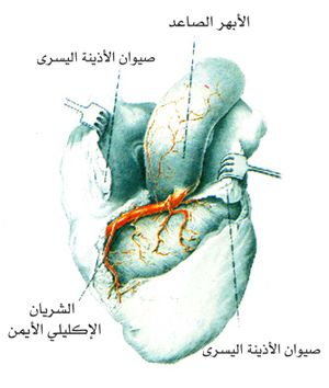 وأما الشرايين الإكليلية فيراد بها الشريانان الإكليليان (التاجيان) المتفرعان عن الأبهر وما يتشعب عنهما من شرايين صغيرة تغذي جدر القلب. ويسمى الشريان الأول منهما الشريان الإكليلي الأيمن أو الخلفي, وهو الأضخم , ويمر في الثلم الأذيني - البطيني ثم في الثلم الخلفي السفلي لما بين البطينين وينتهي هناك. ويسمى الثاني الشريان الإكليلي الأيسر أو الأمامي ويصل إلى الثلم الأمامي بين البطينين وينتهي هناك بعد أن يحيط بقمة القلب, وتتفرع من هذين الشريانين شعب تغذي جدر الأوعية الكبيرة وتفرعات تغذي جدر الأذينين والبطينين.